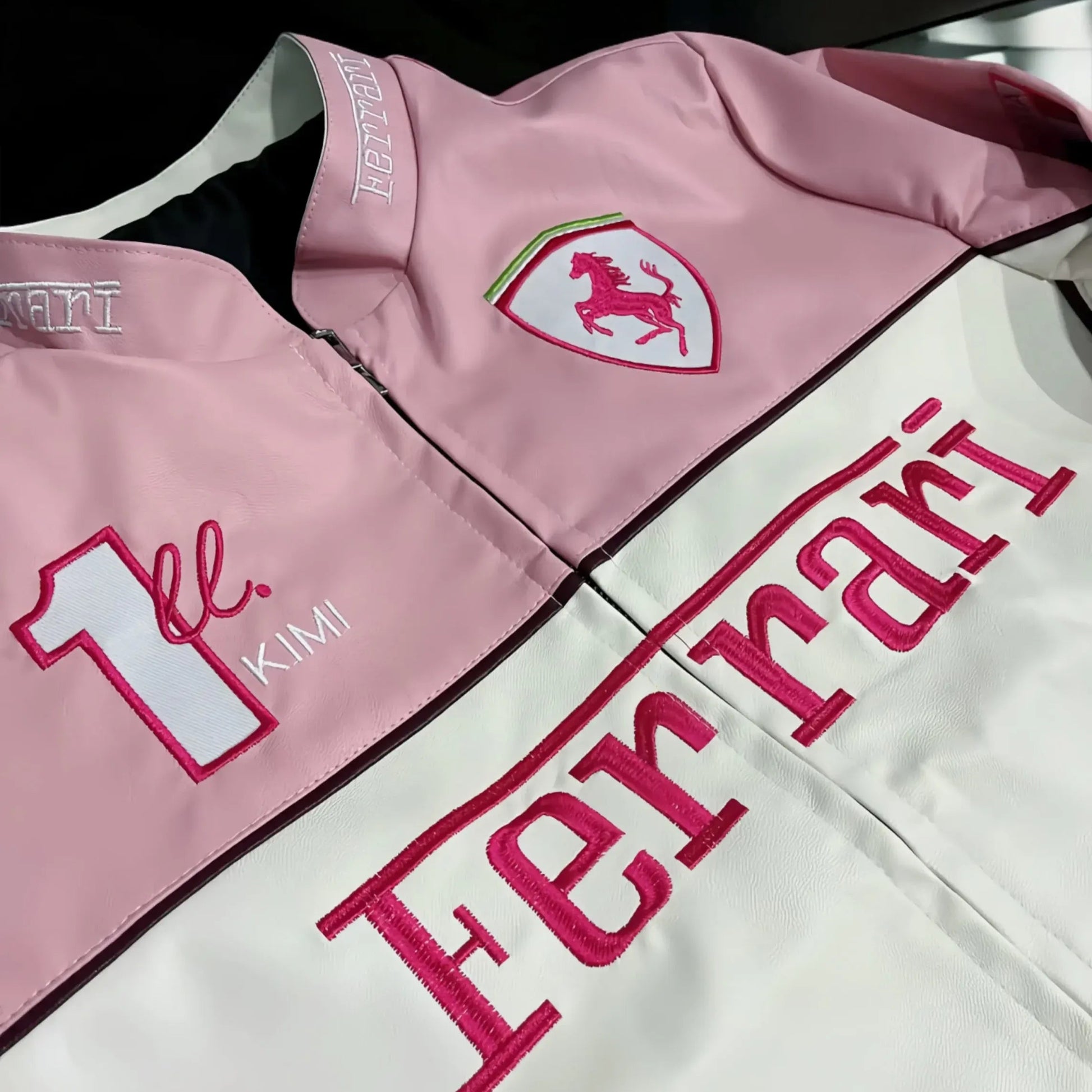 Exklusiv bei Velside erhältlich – die ultimative Rennjacke. Sie ist aus hochwertigem Leder mit handgenähten Details gefertigt, jedes Teil ist mit viel Liebe zum Detail gefertigt. Sie trägt offizielle Sponsorenlogos wie Shell, Marlboro, Olympus und das Ferrari-Emblem. Diese Jacke setzt ein Statement, dem man nicht widerstehen kann.